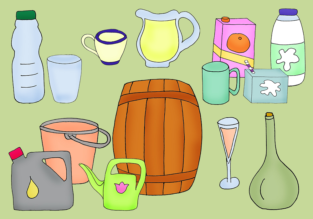 Dieses Paket umfasst 14 Zeichnungen von verschiedenen Behältern inklusive Literangaben, teilweise auch als Umrissbild.