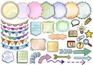 Startseite Illustrationen Kreatives 2: Pfeile, Notizblöcke, Organisationssymbole, Kreise, Kränze, Trenner, Wimpel, Label