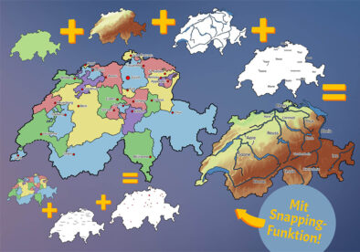 Wenn du zum Beispiel eine unbeschriftete Karte der Schweiz mit Kantonen und Flüssen möchtest, ziehst du einfach diese zwei Teilkarten übereinander.