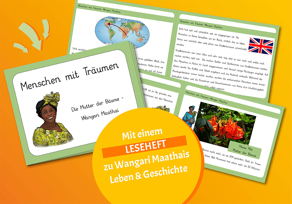 Zu diesem Paket haben wir deiner Klasse ein kleines DIN A5 Heft inklusive Quizfragen rund um Wangari Maathai gebastelt. Lade dir das farbige Heftchen zum Ausdrucken hier herunter.