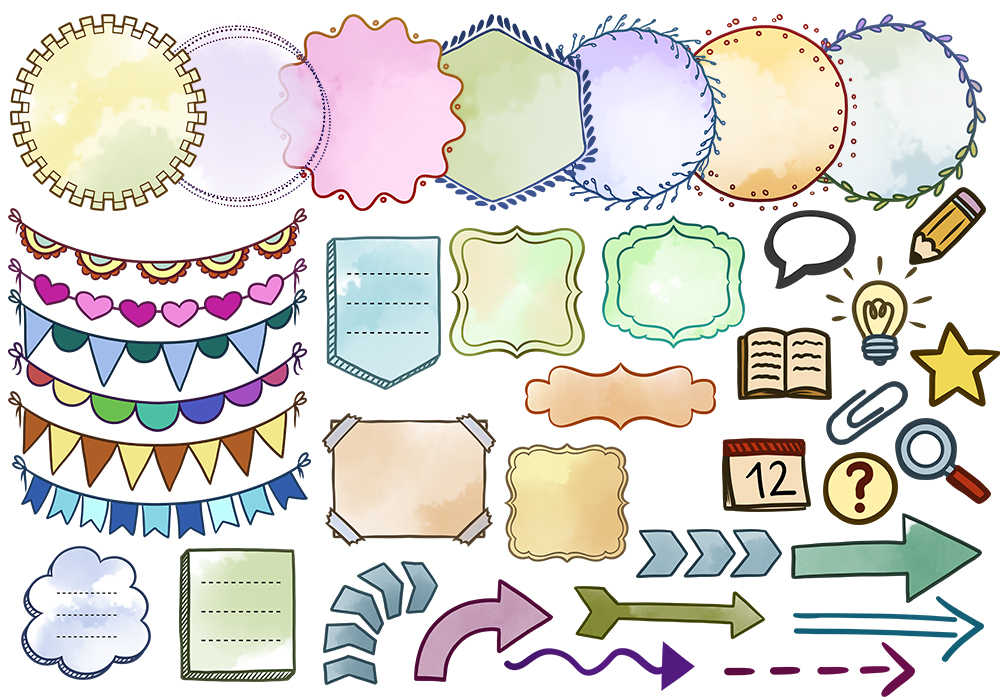 Kreatives 2: Pfeile, Notizblöcke, Organisationssymbole, Kreise, Kränze, Trenner, Wimpel, Label